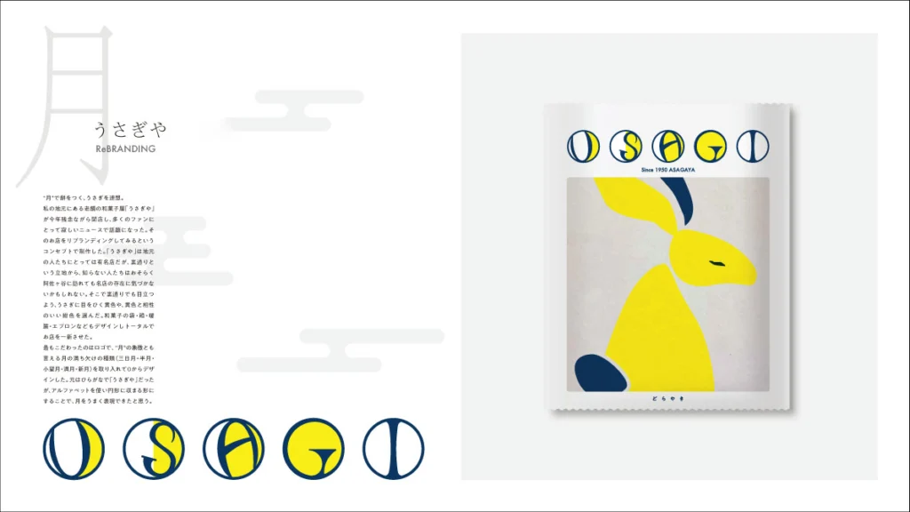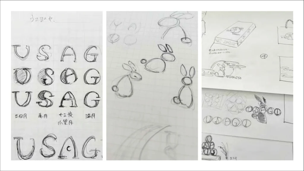 まずはテーマに沿ってアイデアを出します。「和菓子屋さんのリブランディング」という架空の設定をいしたので、お店のロゴやお菓子のパッケージデザインを考えるところから始めました。決定したら、今度は暖簾や紙袋などに合うよう同じデザインで少し違うパターンも考えます。全体的にスケッチができたら、パソコンで作業していきます!