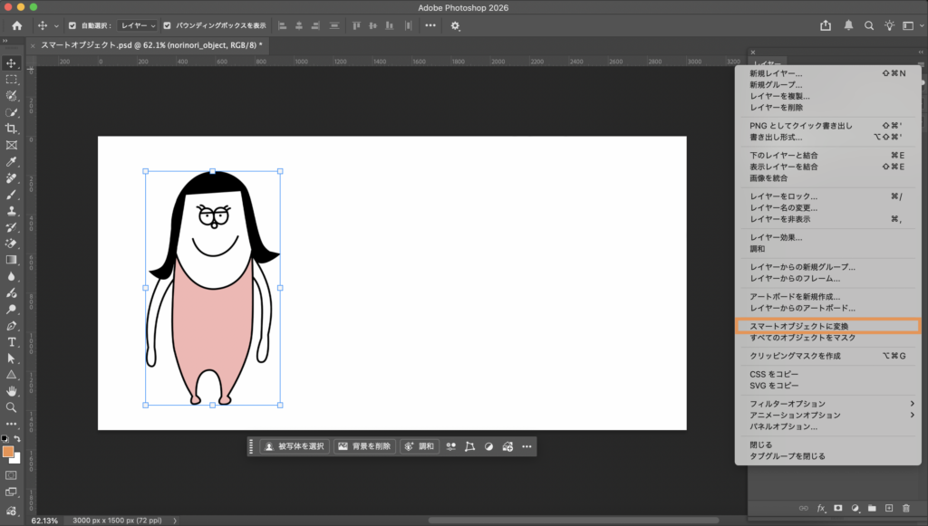 レイヤーを右クリック → 「スマートオブジェクトに変換」または メニュー「レイヤー」→「スマートオブジェクト」→「変換」で簡単に作成ができます。迷ったら最初に変換しておくのがおすすめです。