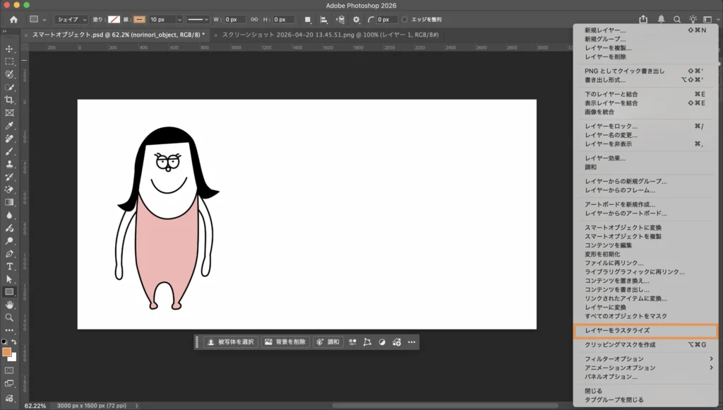 レイヤーを右クリック → 「ラスタライズ」でスマートオブジェクトは必要に応じて通常の画像に戻すこともできます。これで直接編集(ブラシ・消しゴムなど)が可能になります。ラスタライズするとスマートフィルターは消え、元データ情報は失われてもとに戻すことはできないので注意。最終工程でのみ行うのが基本です。